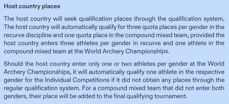 We're going to have some additional folks competing in archery, and that's not just due to the addition of compound. In Paris, we only had 1 guy (Brady Ellison), but in LA, we get three guys (plus one for the mixed compound). We'll retain the same quota of 3 women, plus another one for mixed compound. The addition of the guys means we also get to participate in Men's Team. These quota are subject to the condition that we enter three+one in the World Archery Championship, but that shouldn't be a problem, I wouldn't think. As a reminder, Brady Ellison won silver in 2024, and Brady+Casey Kaufhold won bronze in the mixed team. (Casey got upset in her individual competition.)1 point -