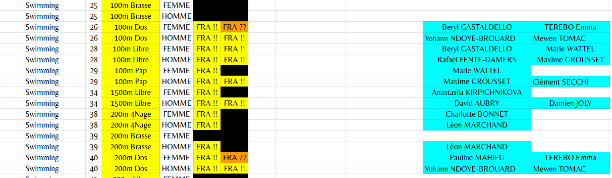 And honestly, I'd be delighted to participate in one way or another (within my means). I've been doing this for France for 12 years now, in an even more complex version, since I add to my accounts the athletes who would qualify thanks to a ranking if the qualification period ended now (things that are far too complex to manage for all 200 nations; especially rankings for sports with a lot of qualifiers). I also differentiate between quotas validated by the French federation—that is, where the participating athletes have been announced—and those where confirmation is pending.