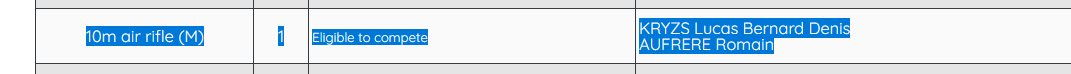 - For swimming and athletics, I take the number of athletes who have achieved the A score, capped at the maximum number of athletes from a nation per event. The drawback is that we're not sure whether a nation will actually use all the quotas it has earned (for example, France almost always uses additional criteria), but this gives an initial estimate that will be refined when the official selections are announced. I don't usually take B scores (which only grant access to a single athlete) because France doesn't usually take them into account, but managing them for smaller nations could be possible, even if more time-consuming. -For shooting, it's the most complicated, since a shooter can participate in as many events as they want as long as they've qualified. For France in 2024, I considered that a shooter who obtained a quota also earned a quota for all the other events in which they appear in the ranking. But it might be more complicated to manage for so many nations and athletes.